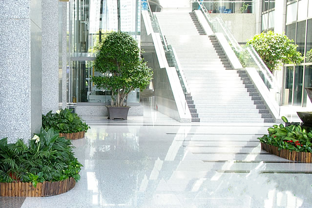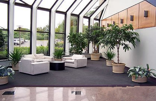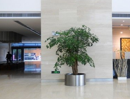 售樓部大廳是接待業(yè)主來訪及商業(yè)洽談聚集活動的地方,總體上應體現(xiàn)典雅大方、回歸自然的格調(diào)。植物應選用能凈化空氣又具有觀葉價值的植物。如幸福樹、大葉傘、鳳尾竹、龜背竹、龍血樹、棕竹、常春藤等等,這些植物不僅能對付業(yè)主從室外帶回來的細菌、小蟲子和其它有害物質(zhì),甚至可以 吸納吸塵器都難以吸收的灰塵。