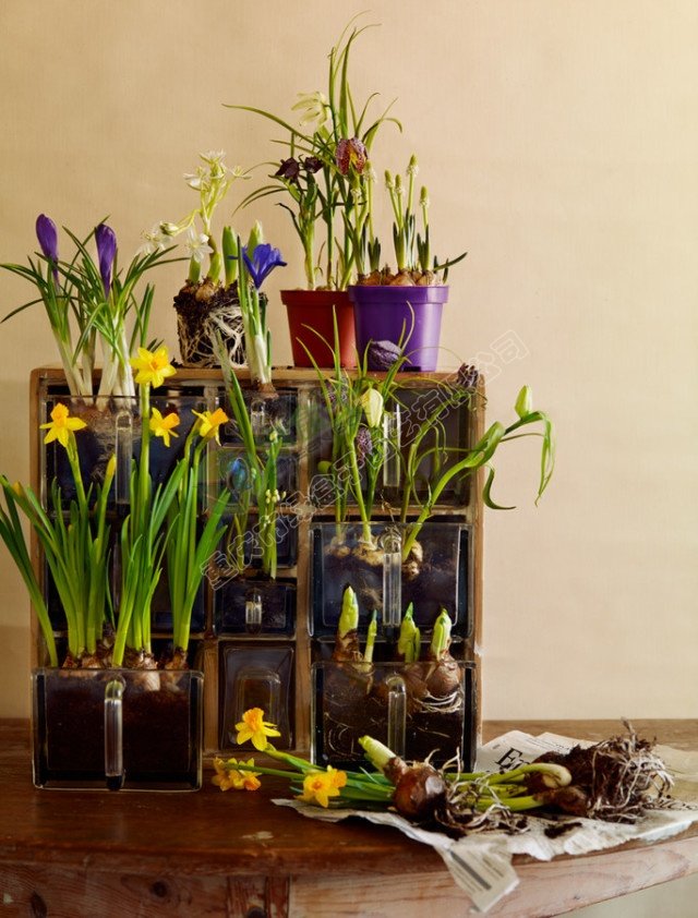 如結(jié)合組合柜布置綠化、結(jié)合吊燈布置綠化等。把又白色郁金香、菊花和雜色常春藤組成的花叢,放在玻璃茶幾下面,透過(guò)玻璃看到各種顏色,也可謂別出心裁。