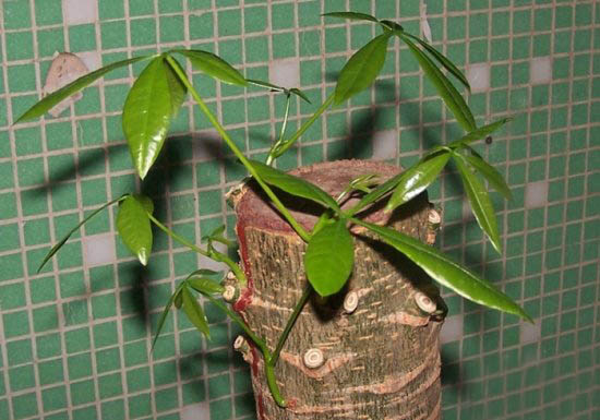 注意:修剪后的枝條,不要淋雨和噴水,防止腐爛,將修剪后的發(fā)財樹放在光線比較明亮的地方或是樹蔭下,要求控制澆水,因為整株上沒有葉片的蒸騰,水分的需要就少了。如果澆水過多會腐爛根系,導致修剪復(fù)壯失敗??稍诎l(fā)芽前施用1-2次以氮肥為主的復(fù)合肥料,如20-10-10的復(fù)合肥料。并且在此期間澆灌一次殺菌劑來防治根系腐爛,如內(nèi)吸性的50%多菌靈可濕性粉劑800-1000倍液,一個月后小枝條就長至5厘米左右,兩個月即可能觀賞。